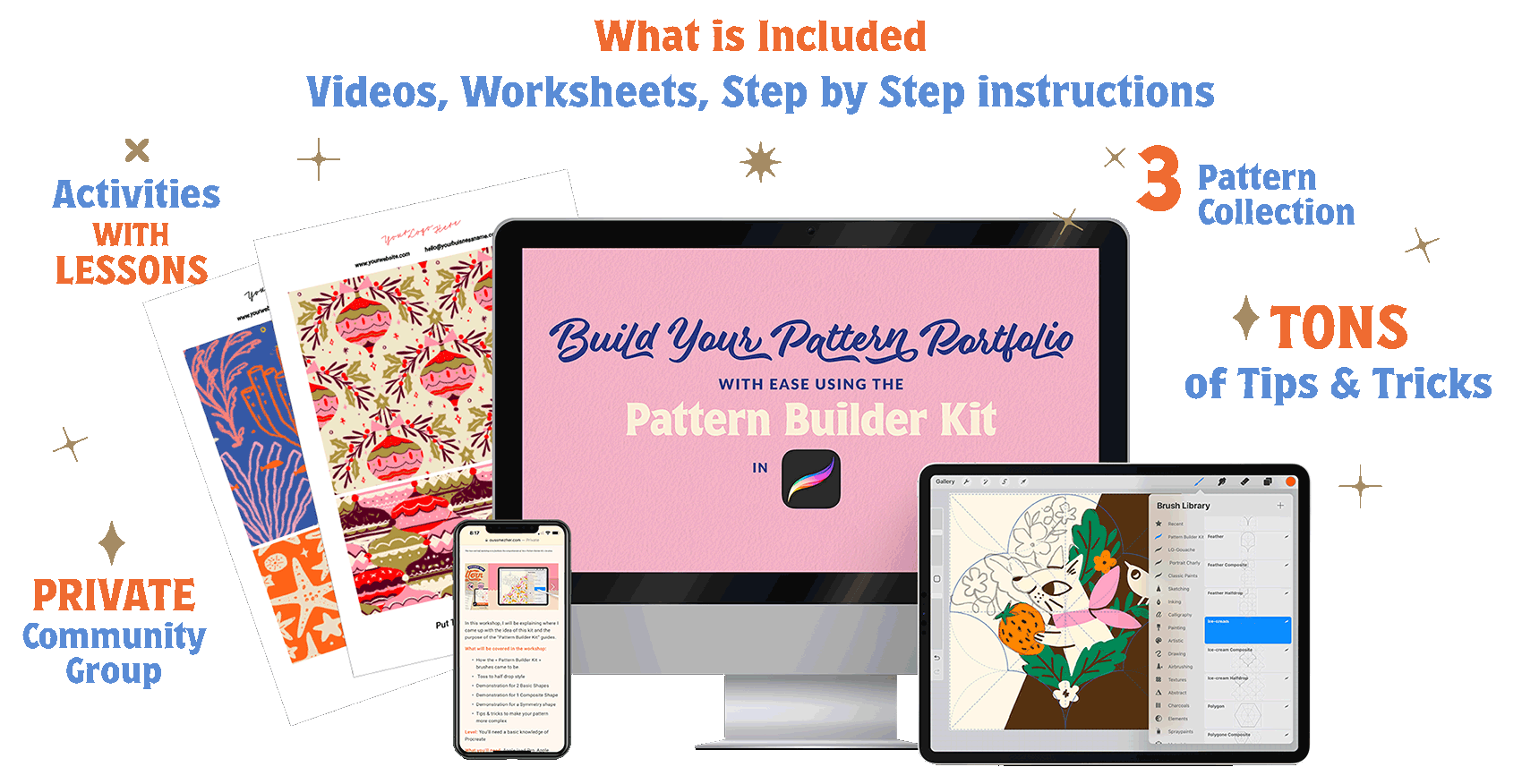 HANDS-ON LEARNING: A solid understanding of how to use the « Pattern Builder Kit » to its full potential, while gaining proficiency in Procreate as you work on your collections.
