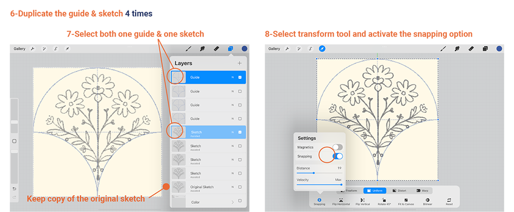 I duplicate the guide brush and the sketch 4 times, while keeping an original copy hidden.